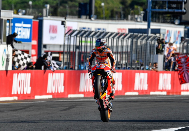 Marc Márquez (Repsol Honda Team) sigue haciendo historia; rompiendo récords; subiendo niveles; y sumando su séptima corona Mundial tras ganar la carrera en Motegi. Andrea Dovizioso comandó la competencia casi en su totalidad; pero cuando el de Cervera lo adelantó cometió un error faltando dos vueltas y le dejó servido en bandeja el título a Márquez. Siete campeonatos en nueve temporadas que le permiten igualar a Mick Doohan con 5 en la clase reina, y se convierte en el piloto más joven de la historia en ganar siete coronas.