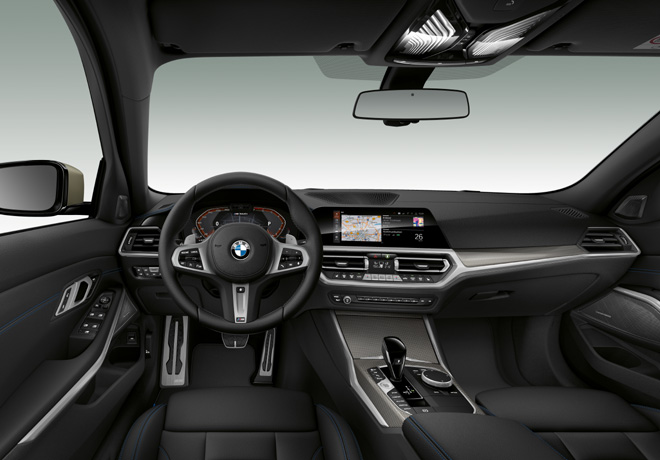 En el interior del vehículo, los asientos deportivos con vestiduras M específicas en Sensatec / Alcantara, el revestimiento interior del toldo BMW Individual en antracita, el volante M revestido en piel con levas de cambio y las franjas de adorno interior en aluminio Tetragon brindan un ambiente orientado al placer de condicuir intensificado . El grupo de instrumentos digitales lleva la inscripción «M340i». Otra característica de diseño exclusivo del BMW M340i xDrive Sedán son los estribos delanteras que también cuentan con el modelo de letras.