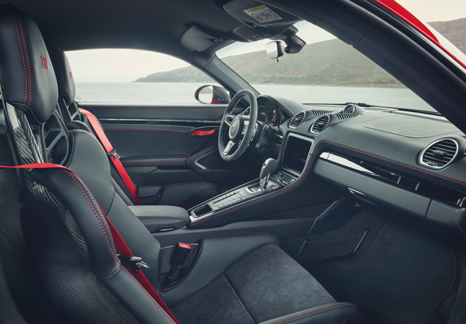 Tradicionalmente, ‘T’ viene de ‘Touring’ en Porsche y es sinónimo del placer de conducir en su forma más pura. El 718 T se sentirá como en casa en carreteras sinuosas, donde la diversión al volante se convierte en objetivo principal. El biplaza se adapta a esta filosofÃa gracias a diversos detalles. Entre otros, las correas de lona negra del interior de las puertas que remplazan las manijas y los asientos deportivos con dos tipos de ajuste eléctrico, que llevan la parte central tapizada en negro Sport-Tex y el logotipo ‘718’ bordado en los reposacabezas.
