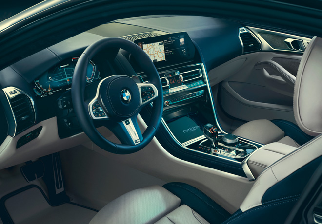El exclusivo aura dentro del BMW M850i xDrive Coupé First Edition también se ve reforzado por las características específicas de diseño de BMW Individual, una excelente selección de colores y materiales y, en particular, equipos de alta calidad. Una característica especial ofrecida para los modelos de la edición es el tapizado completo en piel BMW Individual, en la novedosa combinación de colores Ivory White / Night Blue. Las características de diseño interior que combinan armoniosamente también incluyen el volante M cubierto de piel y el recubrimiento del toldo en Alcántara BMW Individual, cada uno acabado en color Night Blue. Dentro del vehículo, las molduras interiores de BMW Individual en acabado Piano Black, que se encuentran en el centro de la cabina, llevan la inscripción «First Edition 1/400». Además, el sistema de sonido Diamond Surround de Bowers & Wilkins y las aplicaciones de vidrio Crafted Clarity en el botón de Start / Stop, el controlador iDrive, el control de volumen y la palanca de cambio de velocidades iluminada complementan el lujoso ambiente interior.