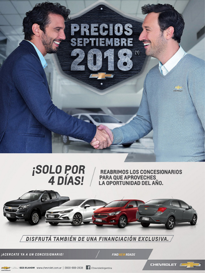 Bajo la modalidad de cierre y apertura de sus concesionarios para preparar importantes beneficios a sus clientes, Chevrolet y su red de concesionarios, a través de sus 125 showrooms, ofrecerán durante 4 días varias versiones de sus principales modelos a precios de septiembre de 2018.