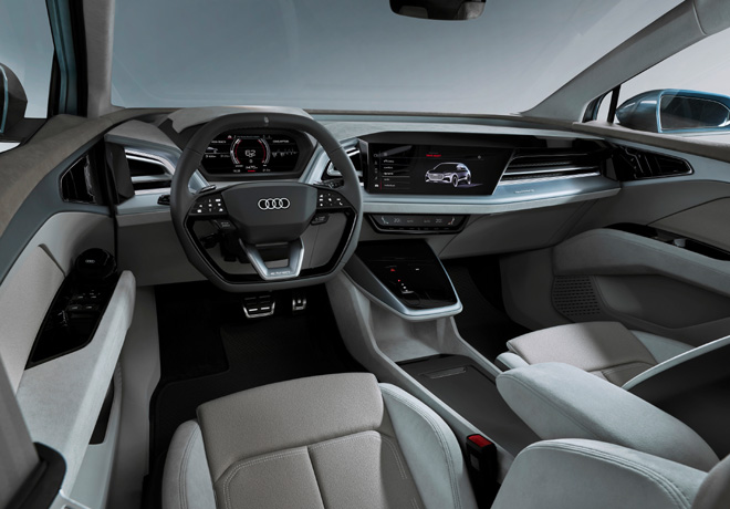 Con 4,59 metros de largo, 1,90 m de ancho y 1,61 m de alto, el Audi Q4 etron concept se posiciona entre los vehÃculos con mayor capacidad de la categorÃa compacta y se convierte en un modelo ágil tanto en ruta como en ciudad. La distancia entre ejes es de 2,77 metros. Al no existir un túnel de transmisión que reste espacio, el Q4 e-tron concept ofrece unas dosis de habitabilidad y confort inesperadas, especialmente en términos de distancia longitudinal para las piernas, tanto en las plazas delanteras como en las traseras.
