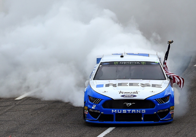 Keselowski tomó el liderazgo al superar a su compañero y autor de la pole, Joey Logano, después de seis vueltas; y fue lÃder por las próximas 319 vueltas (en total fue puntero durante 446 giros), que incluyeron las dos victorias de etapa, en tanto que Chase Elliott, quien acosó a Keselowski sobre el final, lideró 49 vueltas, y Joey Logano sólo 6.