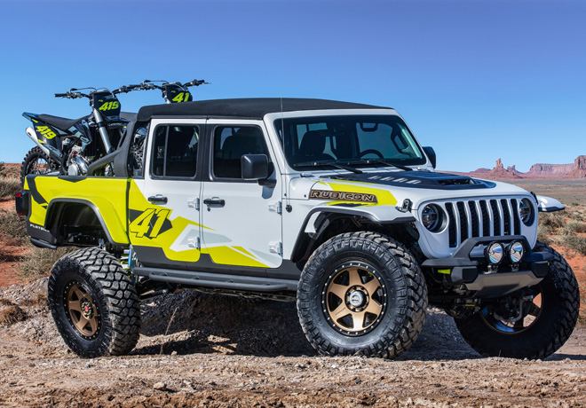 Diseñado con la mirada puesta en aventuras en el desierto, el concepto Jeep Flatbill es otra personalización divertida del nuevo Gladiator mezclada con detalles extremos procedentes del mundo del motocross. Así, el resultado es un vehículo de apariencia inconfundible y llamativa que sirve como el mejor medio de transporte para una variedad de juguetes.