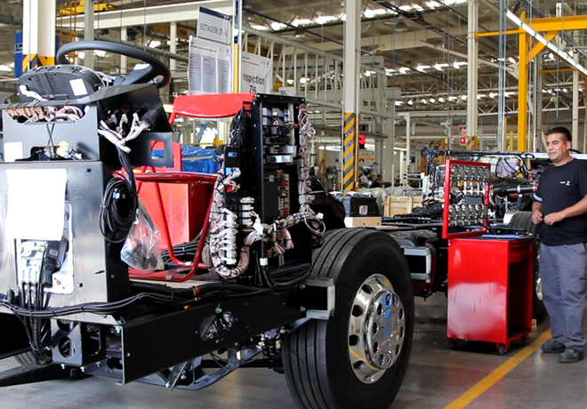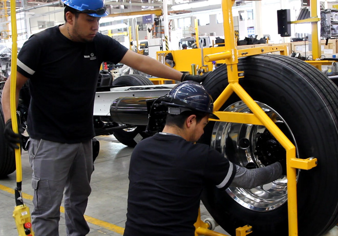 La Línea 2 tiene una infraestructura de seis estaciones de trabajo con una capacidad de 1 chasis por día, operado por 12 personas, entre ellos una mujer operadora, dos operadores de logística y un inspector de calidad.