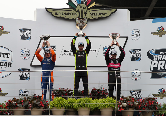 Simon Pagenaud superó a Scott Dixon en la última vuelta por 2.0469 segundos, para alzarse con la victoria. El piloto del Team Penske ganó la carrera NTT IndyCar Series en el circuito de Indianapolis Motor Speedway por tercera vez en su historia de seis carreras.