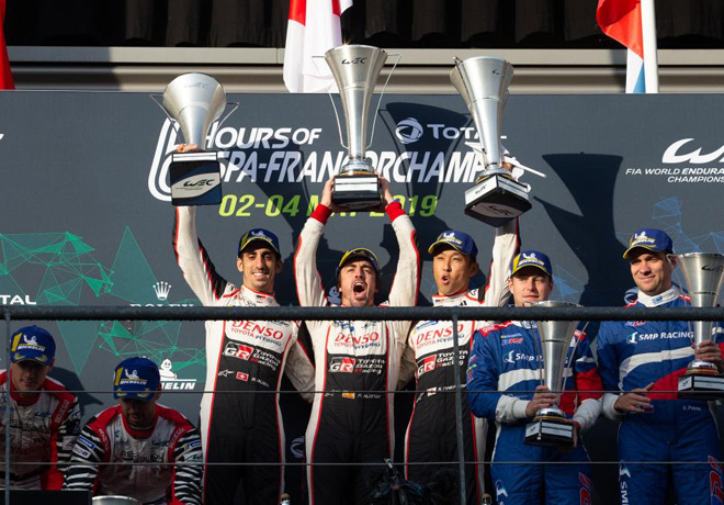 El Toyota Gazoo Racing número 8 conducido por Fernando Alonso; Sébastien Buemi y Kazuki Nakajima fue el vencedor de las 6 Horas de Spa-Francorchamps. Es la cuarta victoria del trío en la Súper Temporada del Campeonato del Mundo de Resistencia de la FIA, que les dio la posibilidad de conquistar el título mundial 2018-2019. Por su parte, Porsche se consagró campeón del Campeonato Mundial de Fabricantes de GTE de resistencia 2018-2019.