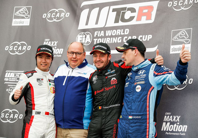 Frédéric Vervisch fue el ganador de la primera carrera en Eslovaquia después de haber partido desde la novena posición en la parrilla, llegando al segundo puesto a poco de iniciada la competencia. Luego superó a Ma Qing Hua para conseguir la primera victoria de este año para Audi.