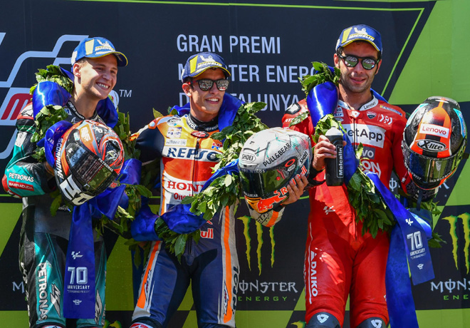 Por delante nada había cambiado. Márquez consumaba su escapada y cruzaba 1º la línea de meta, seguido por un Quartararo que gestionó a la perfección su pequeño margen sobre Petrucci, quien, a su vez, encadenó su tercer podio consecutivo, asentándose en la zona alta de la clasificación general.