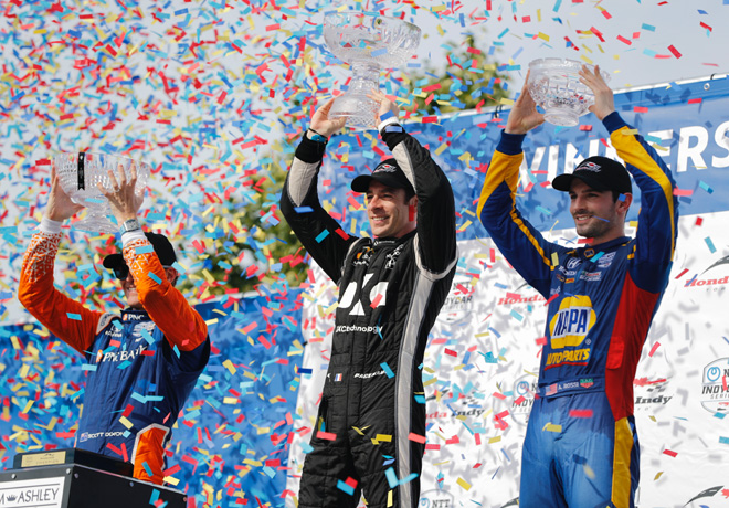 El francés Simon Pagenaud fue el vencedor de la competencia disputada en Toronto, soportando el acecho de Scott Dixon, quien finalizó segundo a 0.1373 del ganador. Tercero se clasificó Alexander Rossi, a 4.2347.