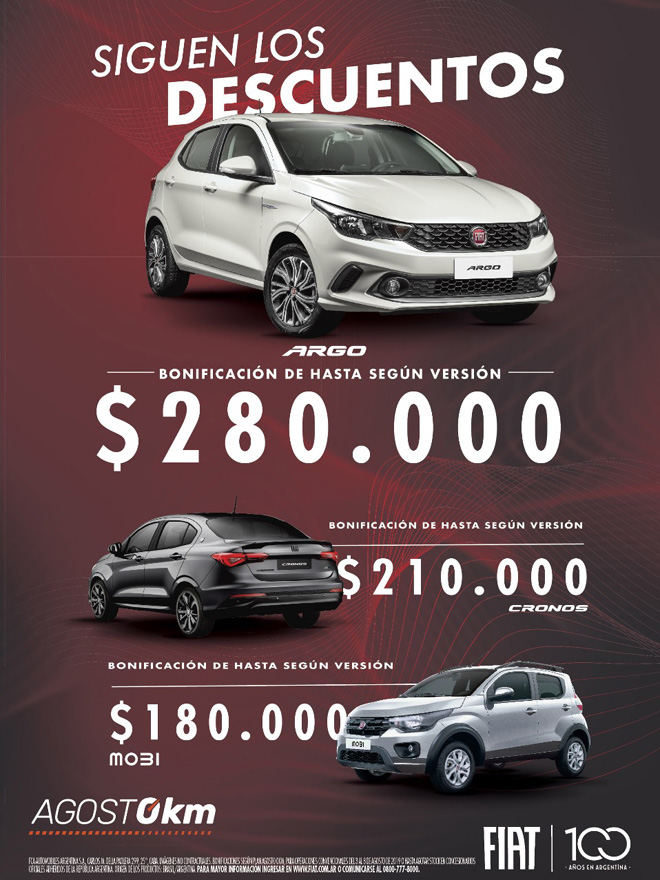 En ese marco, Fiat ofrece en agosto una atractiva propuesta comercial sobre determinados modelos, con bonificaciones que rondan entre los 280 mil y los 140 mil pesos en el caso de los abarcados por el Plan Agost0Km, y de 200 mil a 50 mil pesos para su línea de vehículos utilitarios.