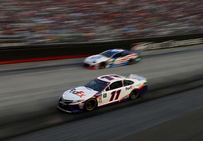 Por su parte Hamlin comenzó desde la pole; dañó su Toyota después de un toque con el Chevrolet de Jimmie Johnson; perdió una vuelta por una parada en boxes no programada en la vuelta 189 por una rueda suelta; recuperó la vuelta de lÃder en la 248, y cargó hacia adelante desde el lugar 13 después de un reinicio de la vuelta 260 para ganar la carrera.