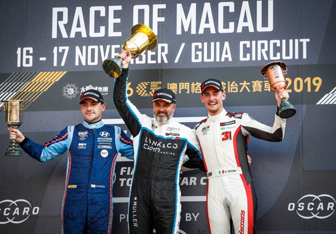 Yvan Muller convirtió su mejor posición de partida producto de su pole position en una victoria en la Carrera 1 del WTCR en Macao, mientras que Norbert Michelisz pasó a encabezar el campeonato. Muller tuvo un comienzo limpio y nunca fue amenazado seriamente por Michelisz, finalmente segundo. Kevin Ceccon completó el podio, mientras Andy Priaulx sacrificaba el tercer lugar para beneficiar a su compañero de equipo y contendiente por el tÃtulo, Thed Björk, quien terminó quinto.