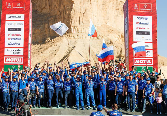 Por fortuna, al fabricante ruso no le faltaban candidatos y pudo contar con su antiguo ganador de 2014, Andrey Karginov. Tras una etapa inaugural algo tímida, el piloto de 43 años ofrece todo un recital con 7 victorias de etapa y un ritmo imposible de seguir para sus rivales, incluidos los compañeros de equipo. Anton Shibalov, segundo en la general con 3 victorias de etapa, se queda a 42 minutos en la meta de Qiddiya. Siarhei Viazovich pasa, por su parte, la meta final a más de dos horas, tras haber albergado ciertas ilusiones al inicio del rally.