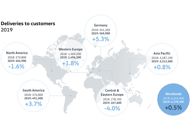 En 2019, Volkswagen entregó 6.278.300 vehículos en todo el mundo, superando la cifra del año anterior en un 0,5%. En un mercado global cada vez más reducido, la marca amplió significativamente su participación en el mercado.