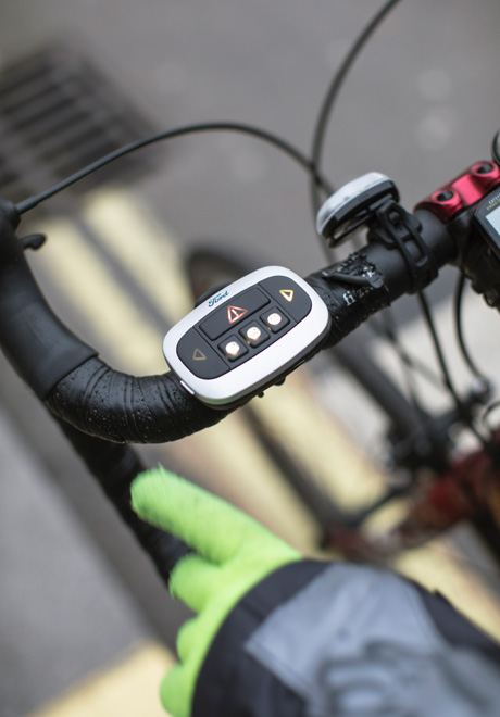 Los ciclistas activan cada Emoji, indicador o la señalización de peligro usando un control remoto inalámbrico montado en el manubrio de la bicicleta.