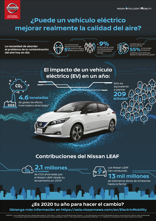 Frente a ello, como parte de su compromiso de reducir las emisiones de CO2, Nissan, el creador del primer vehículo eléctrico para consumo masivo, el Nissan LEAF, ha recopilado un análisis del impacto que el vehículo ha tenido en todo el mundo desde su debut en 2010. Al mismo tiempo, existen datos convincentes para demostrar cómo la movilidad eléctrica puede ser parte de las soluciones para disminuir los niveles de contaminación del aire: