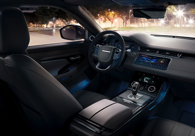 El Keyless Entry permite entrar al vehículo sin presionar ningún botón en la llave. Y aquí, en el interior, la renovación es total. Muestra distintas superficies limpias y sofisticadas, destacando la división de la consola en dos. Por un lado, un display Interactivo de conducción de 12,3” pulgadas que se configura a gusto del conductor, con diversas opciones de visualización de información y por otro la doble pantalla multimedia, de 10” pulgadas cada una y con sistema Touch Pro Duo, que cuenta con los novedosos Apple CarPlay y Android Auto. Esto, sumado a un sistema de sonido de alta fidelidad de la marca Meridian, el climatizador bi-zona, el sistema Head-Up Display, las luces de interior configurables y el techo panorámico, convierten al nuevo Range Rover Evoque en el mejor lugar para recorrer la ciudad.