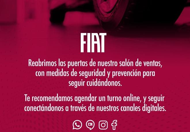 Fiat, en el contexto de la cuarentena administrada en algunas zonas del país, ya comenzó con la reapertura de los salones de venta y talleres de los concesionarios de su red oficial, que fueron autorizados expresamente, en provincias y localidades donde las autoridades decidieron aprovechar las flexibilizaciones autorizadas por el gobierno nacional.