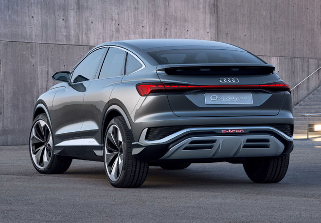 Su diseño exterior evidencia las nuevas líneas de la marca. En la parte posterior, la silueta del Sportback se inclina hacia abajo en una curva sutil y dinámica. El alerón sobre el borde inferior de la luneta le imprime deportividad y dinamismo. La llamativa banda luminosa que conecta los faros traseros del Audi Q4 Sportback e-tron concept se reitera, como en el Audi Q4 e-tron concept. Gracias a esto es claramente visible que ambos modelos pertenecen a la misma familia e-tron.