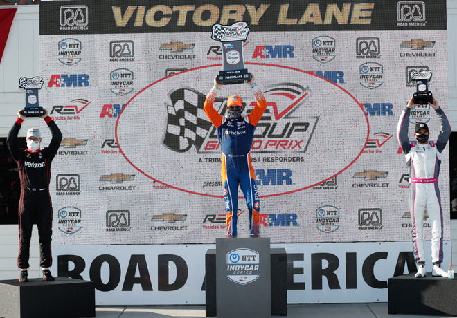 Luego de 56 vueltas, Scott Dixon fue el vencedor de la primera competencia del fin de semana disputada en el circuito de Road America de 6.515 metros de extensión, superando a su escolta Will Power por 2.5386, mientras que tercero finalizó Alex Palou, a 3.1928 del vencedor. Esta fue la tercera victoria en la temporada del quíntuple campeón de Indy Car, vencedor de la Indy 500 en 2008, y la número 49 del neozelandés en la categoría.
