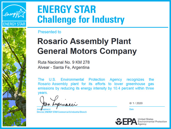 General Motors recibió la certificación “Energy Star Challenge Award” para su parque industrial instalado en Alvear, Rosario por haber reducido un 10,4% el consumo de energía por vehículo en el periodo 2017 – 2019. Este reconocimiento es un paso más más entre las iniciativas de la compañía hacia un futuro con Cero Accidentes, Cero Emisiones y Cero Congestión.