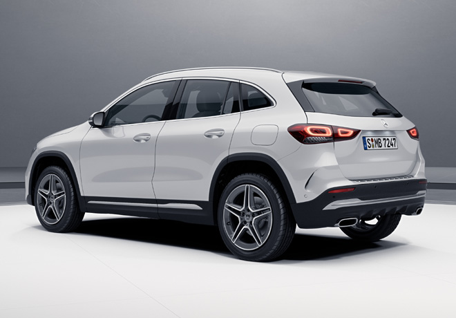 La GLA acredita proporciones externas poderosas, con voladizos cortos adelante y atrás. Resaltes longitudinales esbozados sobre el capó subrayan la desenvoltura del SUV, al igual que las ruedas grandes de hasta 20 pulgadas, enrasadas con el exterior de la carrocería.