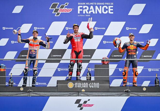 Danilo Petrucci (Ducati Team) brindó a Ducati la primera victoria del constructor italiano en Le Mans al sumar una brillante victoria en mojado, la segunda de su palmarés, después de una carrera perfecta repleta de alternativas en la que acabó acompañado en el podio por dos fabulosos Alex Márquez (Repsol Honda Team) y Pol Espargaró (Red Bull KTM Factory Racing).