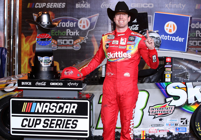 El último embalaje se aproximaba. Bowyer entró a reabastecer en la vuelta 311, Busch volvió a la cima del clasificador y apostaba a economizar combustible al máximo posible y en dialogo constante con su equipo para manejar la situación y llevarse su primera victoria del año que corta una racha adversa de 33 carreras; segundo arribó su coequipier Martin Truex Jr. y tercero el novato Christopher Bell, todos con Toyota Camry.
