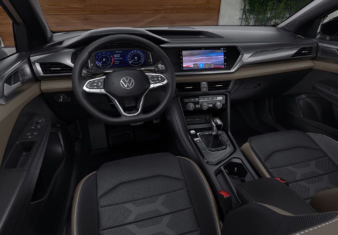 Taos también se destaca por su frente elevado que, complementado por líneas angulares fuertes en el paragolpes, le otorgan un diseño dinámico y ágil. Como principal novedad allí, estrena la nueva firma nocturna de la marca, que conecta los faros con una guía de luz LED que recorre la parrilla de lado a lado. Este elemento enfatiza la sofisticación, modernidad y tecnología que caracteriza al nuevo SUV. Esta nueva identidad también puede encontrarse en los faros traseros del vehículo, donde se incorpora el mismo estilo de líneas. De esta forma, el nuevo Taos cuenta con un diseño único dentro de la marca y el mercado.