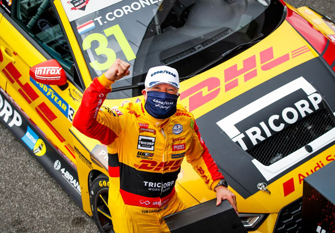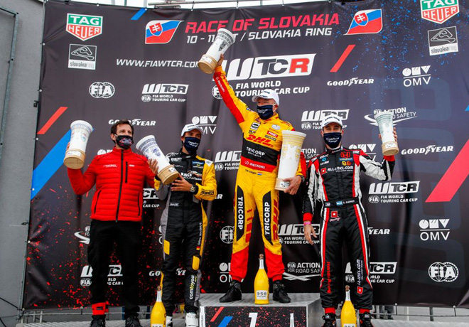 Tom Coronel consiguió una sensacional primera victoria en el WTCR, cuando Néstor Girolami sufrió un accidente en la segunda carrera en Eslovaquia.