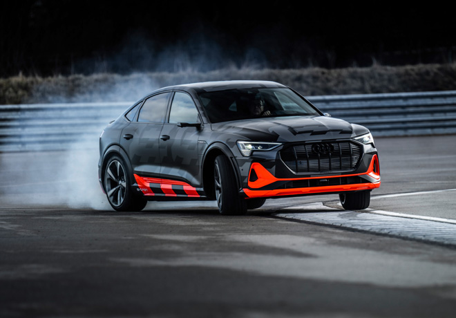 En los Audi e-tron S y e-tron S Sportback, el sistema quattro se acompaña de un vector de par eléctrico. La vectorización del par eléctrico, que implica la distribución de energía entre las ruedas, lleva solo milisegundos. También puede activar un par elevado, lo que permite que el automóvil se conduzca con tanta energía en las curvas como un deportivo. Audi es el primer fabricante en el segmento premium en producir en volumen la tecnología utilizando tres motores eléctricos.