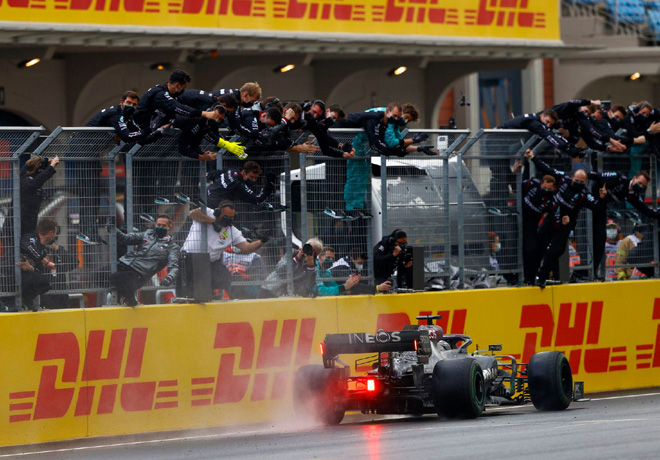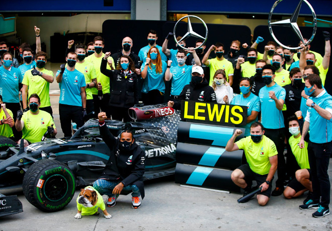 Una impresionante conducción de Lewis Hamilton con el Mercedes-Petronas en el Gran Premio de TurquÃa le dio su décima victoria de la temporada y, lo que es más importante, le permitió conseguir el séptimo tÃtulo de pilotos de su carrera para igualar el récord de Michael Schumacher. Sergio Pérez con el Racing Point y Sebastian Vettel con la Ferrari acompañaron a Hamilton en el podio.