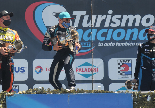 El piloto cordobés logró una importante victoria en la sexta fecha del TN disputada este domingo en el trazado platense; Chapur compartió el podio con Jerónimo Teti y Antonino GarcÃa.