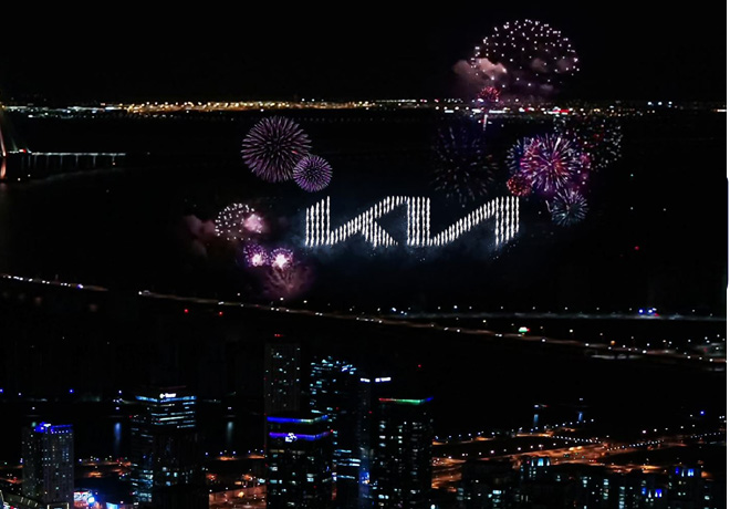 El nuevo logo se dio a conocer durante una exhibición pirotécnica récord en los cielos de Incheon, Corea. El evento contó con 303 pyrodrones lanzando cientos de fuegos artificiales en una exhibición artística sincronizada, encendiendo y celebrando el nuevo comienzo de Kia. Esto estableció un nuevo récord mundial Guinness por «La mayor cantidad de vehículos aéreos no tripulados (UAV) lanzando fuegos artificiales simultáneamente”.