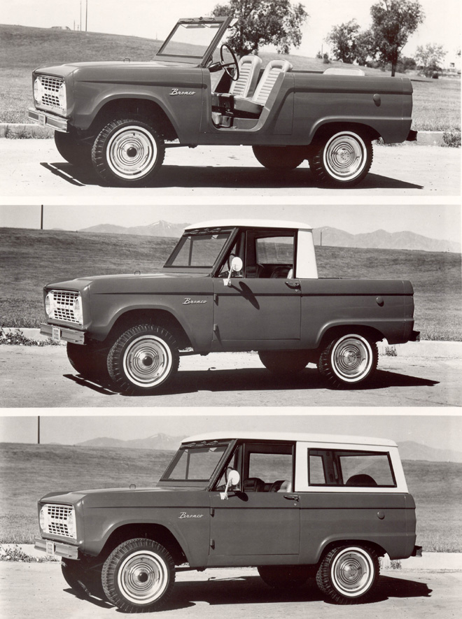 Los primeros borradores de Bronco datan del 24 de julio de 1963 y fueron realizados por McKinley Thompson, el primer diseñador afroamericano de la compañía. Mostraban la forma cuadrada clásica del vehículo en una versión de dos puertas. La idea pasó por múltiples revisiones y transformaciones hasta que en 1965 se presentaron oficialmente los primeros tres modelos: Roadster (sin techo), Sports Utility (Utilitario deportivo) con caja y Wagon (dos puertas, cola larga y techo completo); este último fue el modelo más popular.
