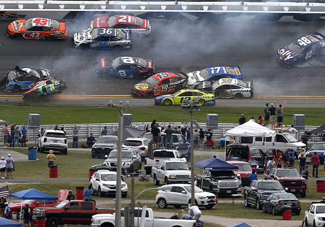 El «Big One» de la vuelta 15 dejó un tendal en el lote de punta, Bell (Toyota-Gibbs) lo rozó a Bowman (Chevrolet-Hendrick) desencadenando una carambola que afectó a Almirola, Truex Jr, Erik Jones, Kurt Busch, Newman, Reddick, Blaney, Buescher, Di Benedetto, Byron, Ragan, Alfredo y Suárez, así quedaron muchos vehículos dañados y algunos no pudieron continuar.