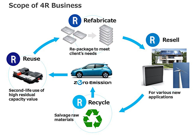 Por eso, varios meses antes de que saliera al mercado el primer LEAF en diciembre de 2010, Nissan se asoció con Sumitomo Corp. para establecer 4R Energy Corp. Su objetivo: desarrollar la tecnologÃa y la infraestructura para re-fabricar, reciclar, revender y reutilizar las baterÃas de los vehÃculos eléctricos de Nissan, no por su valor de desecho, sino para dar energÃa a otras cosas.