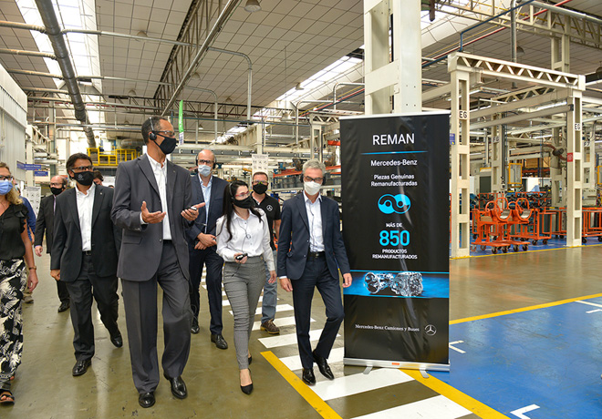 Además, visitó el sector donde funciona REMAN, la unidad de Mercedes-Benz destinada a la manufacturación de piezas (motores y cajas de velocidad) de camiones y buses, que cumple con los más altos niveles de calidad y cuenta con una línea de producción de última tecnología. REMAN tiene impacto positivo en el medio ambiente, ya que reduce la contaminación por descarte.