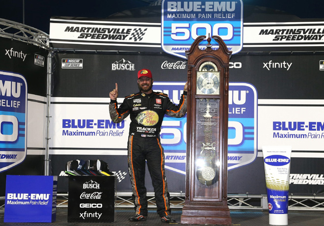 La Blue-Emu Maximum Pain Relief 500 se inició con una primera parte a 130 vueltas y con el liderazgo de Hamlin a partir de la vuelta 4; William Byron (Chevrolet-Hendrick) era segundo hasta que el poleman Logano recuperó el puesto en el giro 26, pero todo se detuvo en la 42a. ronda porque la lluvia volvió a caer sobre Martinsville, entonces los autos fueron conducidos a boxes hasta el dÃa siguiente indefectiblemente.