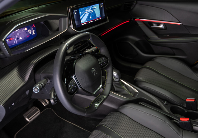 El habitáculo cuenta con detalles muy cuidados, como la tapicería de techo negra, detalles de color, asientos dinámicos y pedales de aluminio. Diversos aspectos que acompañan el tapizado exclusivo y un volante con inserto cromado. Otro aspecto destacable es el Pack Led RGB Ambiente: un sistema de iluminación interior que permite seleccionar entre 8 colores, tanto durante el día, como durante la noche. Además, cuenta con un tablero digital con su sorprendente efecto 3D, una pantalla táctil HD de 10 pulgadas y combinada con teclas estilo piano, y un cargador inalámbrico para smartphones con tecnología de inducción Qi. Todos ellos enriquecen el reconocido puesto de conducción ergonómico Peugeot i-Cockpit 3D.