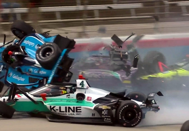 Multiple cars involved in this crash at the beginning of the @IndyCar race at @TXMotorSpeedway.@ConorDaly22 flips, but all drivers are ok.
