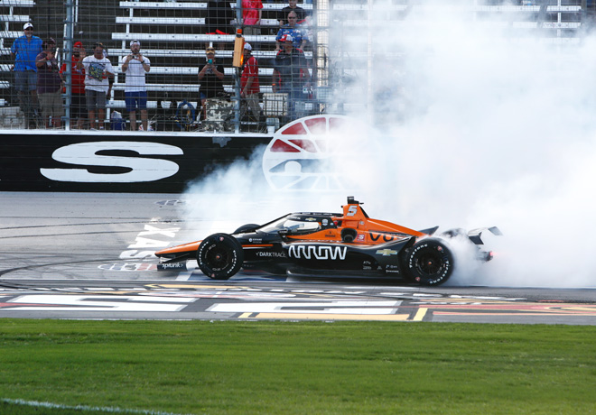 El piloto mexicano del Arrow McLaren SP alcanzó su primera victoria al ganar en la segunda carrera en el óvalo del Texas Motor Speedway.