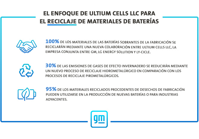 El nuevo proceso de reciclaje permitirá a Ultium Cells reciclar los materiales de las baterías, incluidos el cobalto, el níquel, el litio, el grafito, el cobre, el manganeso y el aluminio. El 95% de estos materiales puede utilizarse en la producción de nuevas baterías o para industrias adyacentes.