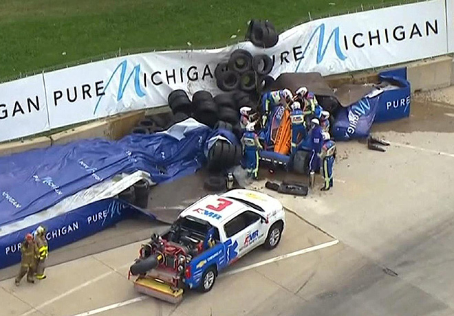 En la vuelta 25 se produjo el fuerte choque de Felix Rosenqvist en la curva 6, su auto impactó las defensas y quedó debajo de las gomas de protección derribando uno de los muros de contención.