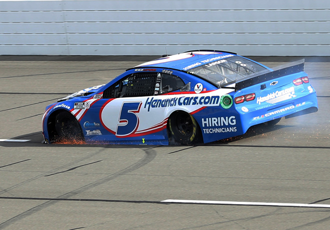 Por su parte Larson punteó 15 vueltas, pero no pudo lograr una cuarta victoria consecutiva en la Serie de la Copa. Estaba a un giro de mantener intacta su racha, pero el neumático delantero derecho pinchado lo envió a toda velocidad hacia el muro de contención de la Curva 3, y finalmente llegó en el noveno lugar.