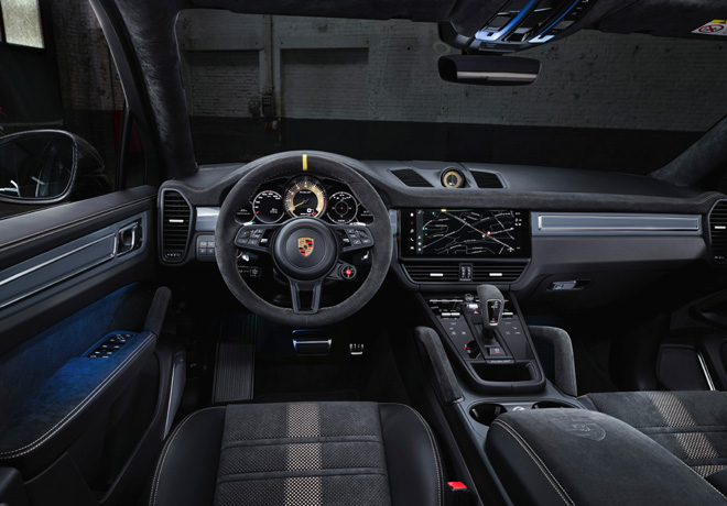 El carácter deportivo del Cayenne Turbo GT se realza con un equipamiento de serie de gran calidad y con los numerosos elementos en Alcantara del interior. Los asientos delanteros deportivos de ocho reglajes y un sistema de asientos traseros deportivos con solo dos butacas también forman parte del equipamiento estándar. Todos ellos son especÃficos del GT, con los paneles centrales de Alcantara perforados, detalles de contraste en Neodyme o Plata Arctic y las letras ‘turbo GT’ en los reposacabezas. Como es de esperarse de un deportivo Porsche, el volante multifunción lleva la marca de las 12 horas en amarillo. Dependiendo del acabado, algunas molduras están terminadas en negro mate.