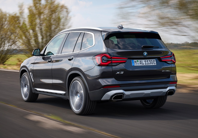 El modelo híbrido conectable BMW X3 xDrive30e está reservado para el SAV. Su sistema consta de un motor de gasolina de 4 cilindros combinado con un motor eléctrico cuya potencia se transmite a las cuatro ruedas. La potencia del sistema en conjunto de 215 kW / 292 hp se puede incrementar hasta en 30 kW / 41 hp mediante el uso temporal de la potencia pico del motor eléctrico. Tiene una batería de iones de litio de alto voltaje que permite una autonomía eléctrica de hasta 50 kilómetros.