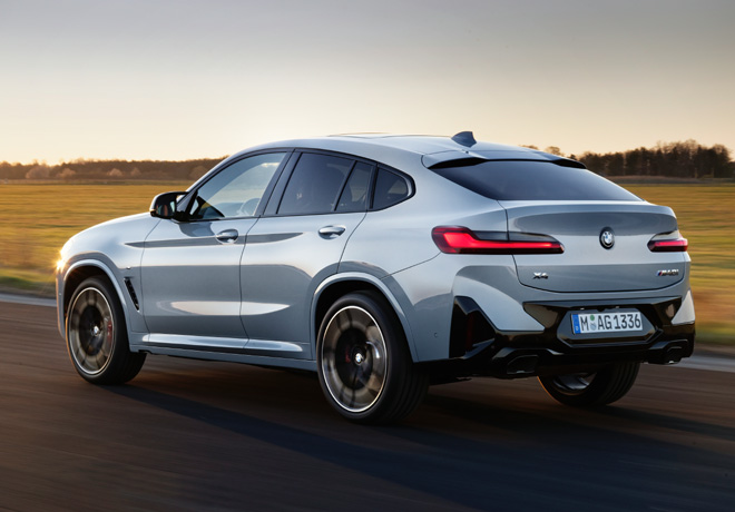 En las versiones a partir del paquete M Sport en adelante, el BMW X4 presenta la parrilla en forma de riñón doble BMW de malla, cuyo marco y las inserciones están pintadas en color negro brillante bajo pedido, así como un nuevo faldón trasero con una inserción ancha y desplazada en forma de yunque. Al igual que los paneles de las cortinas de aire laterales, está acabado en color negro de alto brillo y da una impresión general poderosa que está claramente orientada a la carretera. Al igual que con el BMW X3, el paquete M Sport incluye los rines de aleación de 19 pulgadas de radios en Y estilo 887M en acabado Midnight Grey Bicolor con neumáticos 245/50 R19 de serie. Los rines adicionales de 20 y 21 pulgadas y el freno M Sport están disponibles como opciones.