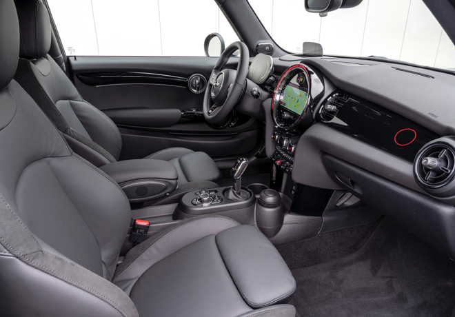 El equipamiento interior de la edición incluye asientos deportivos John Cooper Works en acabado Dinamica / piel Carbon Black, revestimiento interior del toldo en color antracita, juego de pedales de acero inoxidable y molduras interiores en acabado Piano Black de alto brillo. El anillo rojo del logotipo original de John Cooper adorna la tapa del maletero y la superficie interior del lado del pasajero. Del lado del conductor, la superficie interior presenta las firmas de John, Mike y Charlie Cooper. Como una indicación más del carácter exclusivo de la edición, el interior del marco de la puerta del conductor presenta un emblema con la firma de John Cooper, la nota manuscrita «1 de 740» y las palabras «60 Years of MINI Cooper – The Unexpected Underdog».